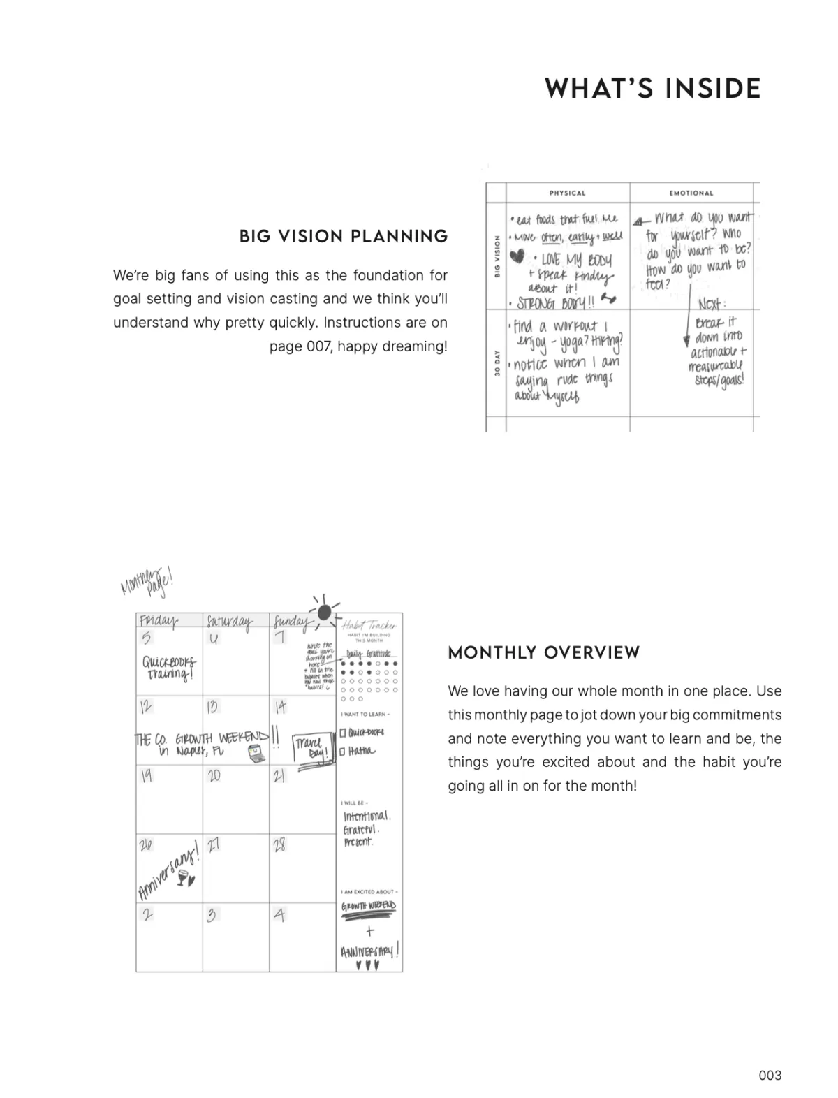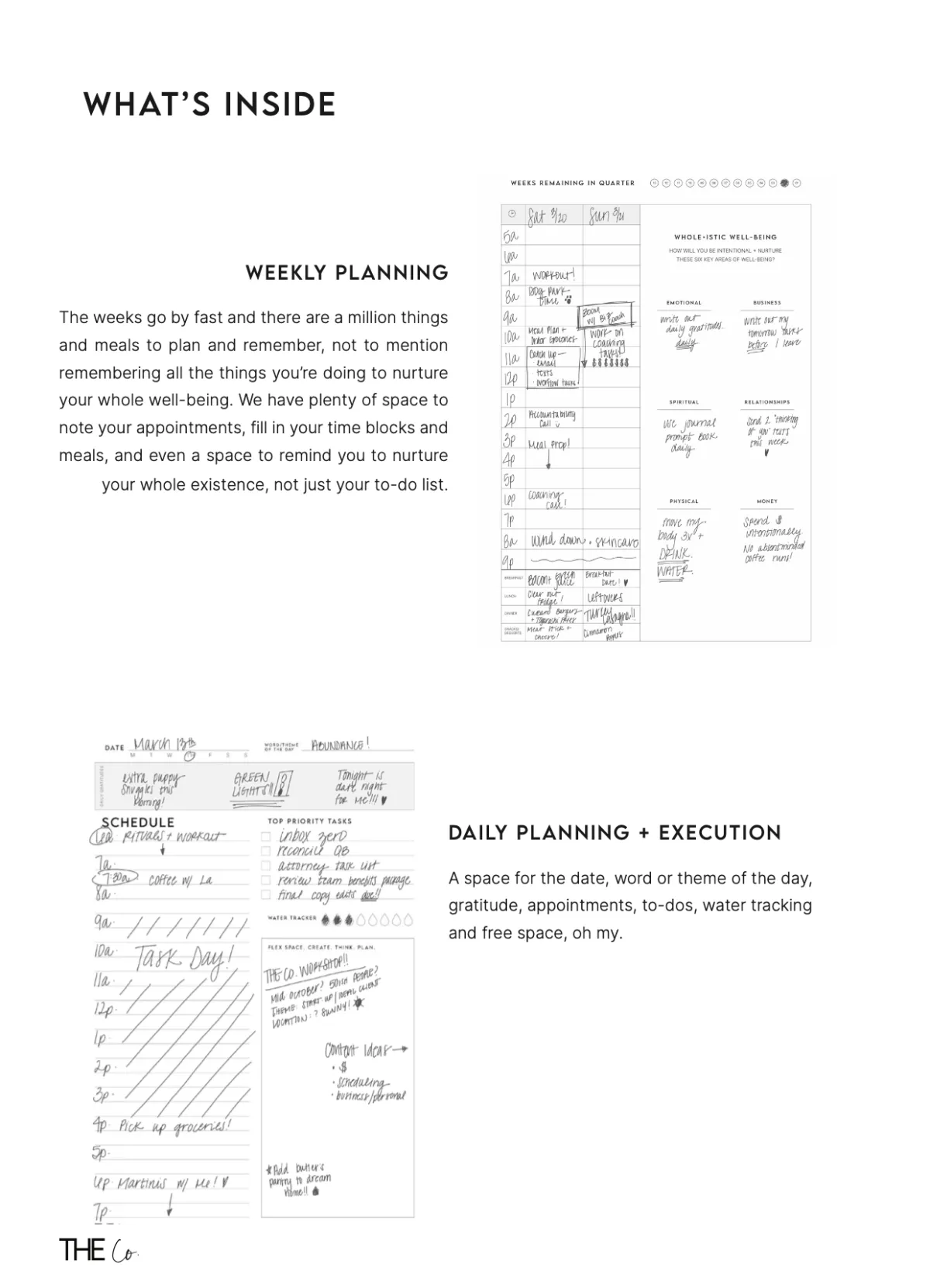 ✔️ This planner was made to help creative entrepreneurs discover their mindset challenges, add structure to goal-setting, and work to marry the creative heart and business brain, all without forcing you to move through life with rigid schedules and strict routines.